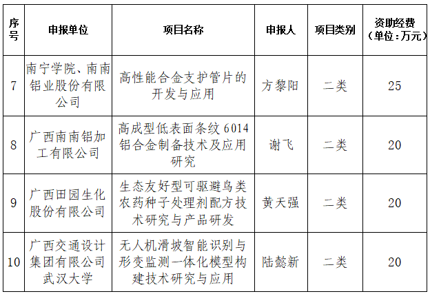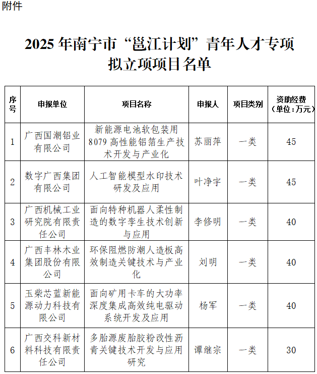 根据《中共南宁市委员会教育科技人才工作领导小组人才工作专项小组办公室关于开展2025年南宁市“邕江计划”四个专项申报工作的通知》文件要求,我局组织开展了2025年南宁市“邕江计划”青年人才专项申报工作,经企业申报、资格审查、专家评审、实地调研、集体审议等程序,现提出2025年南宁市“邕江计划”青年人才专项拟立项项目10项,拟下达经费325万元。现将拟立项项目予以公示,公示期:2025年8月27日—9月2日(共5个工作日)。